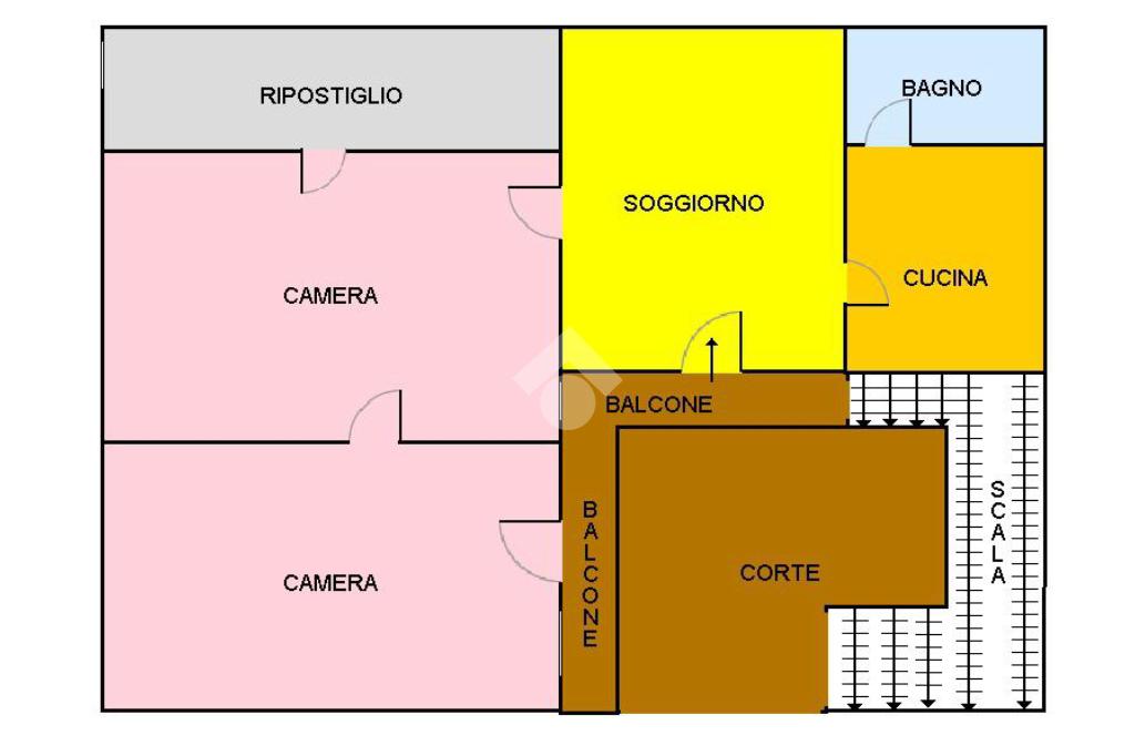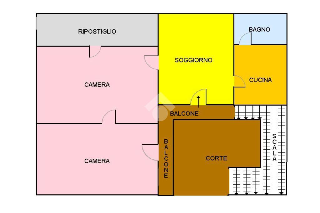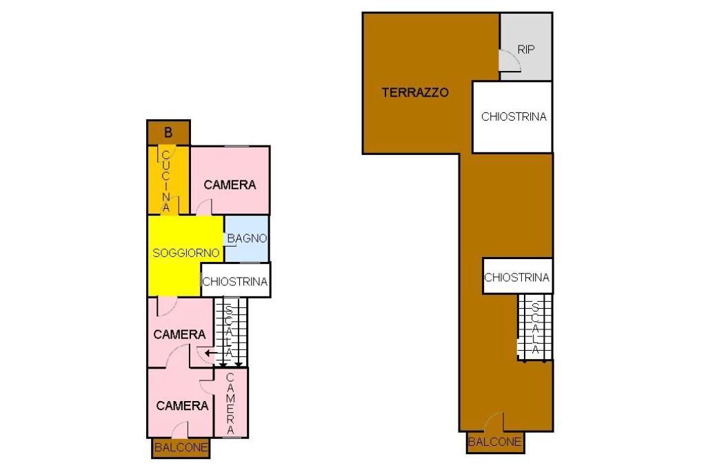 Al 1° piano sono ubicati due appartamenti: uno è un tre vani con ingresso dal cortile interno; l'altro è un ampio quadrivani, al quale si accede da un ingresso indipendente, con terrazzo sovrastante di proprietà esclusiva su cui insiste un locale di sgombero.